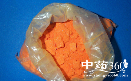 【药材性状】橙红色片状或粉状结晶,片状者厚约2毫米,一面光滑,略具光泽,另一面较粗糙,似附一层粉末。粉末橙色。体重,质硬脆,片状者易折断,断面散有稀疏细孔。气微,味淡。