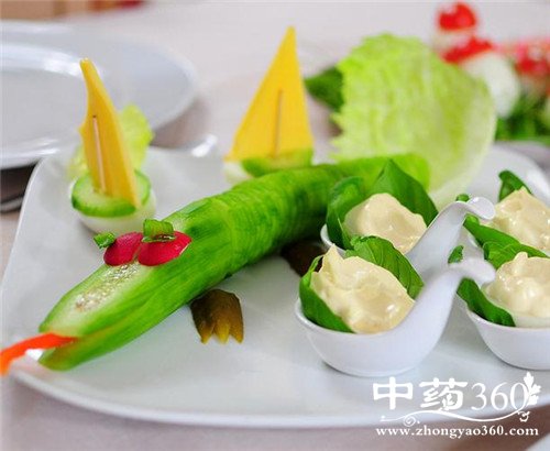 黄瓜中所含的丙醇二酸,可抑制糖类物质转变为脂肪。此外,黄瓜中的纤维素对促进人体肠道内腐败物质的排除和降低胆固醇有一定作用,能强身健体。