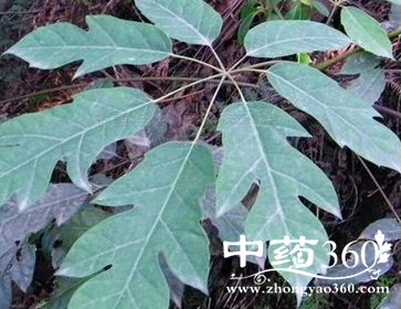 【原形态】乔木灌木,高3-8m。茎粗大,外表暗褐色;小枝粗壮,幼时必生黄棕以星状绒毛,后即脱落;具白以片状髓心。掌状复叶有小叶4-7;叶柄长4-16cm,最长可至70cm,幼时密生星状绒毛,成长圆形,卵状披针形或长圆状披针形,长6-20cm,最长可达35cm,宽2-8cm或稍宽;先端急尖或短渐尖,基部钝形至圆形;全缘具疏离不整齐粗齿或1-3浅裂至深裂,上面无毛,下面密生灰白以或黄棕色星状绒毛,主脉粗而明显;侧脉8-12对,上面坦或微隆起,下面稍隆起,网脉上面稍下陷,稀平坦,下面为绒毛掩盖而不隆起。花无梗,穗状花序聚生成大圆锥花序顶生,长12-10cm,主轴和分枝幼时均密被星状绒毛,后毛逐渐脱落,分枝长10-30cm;苞片卵形,长4-5mm,小苞片三角状卵形,长1-2mm,均密被星状绒毛;萼长1.5-2mm,疏被星状短柔毛,边缘有4-5齿;‘花瓣4-5,三角状卵形,长约2mm,无毛,花白色;雄蕊5,花丝长约3mm;子房下位,4-5室;花柱合生成柱状,柱头不明显,花盘隆起。果实球形,直径约4mm,紫黑色,几无毛;宿存花柱长1.5-2mm。花期10-11月,果期翌年1月。