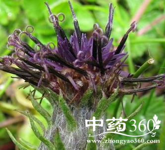 【原形态】蒲公英叶风毛菊 多年生草本,高1-10cm。根颈粗壮,密被褐色纤维状残叶柄。茎单一,直立紫褐色,被白以绵毛。叶基生;叶柄紫红色,被白色绵毛;叶片长圆形,长3-8cm,宽1cm,倒向羽状分裂,裂片类三角形,叶下面密被白色茸毛;茎生叶小、近无柄。头状花序,单生茎顶;总苞钟状,直径1.2-2cm,光滑或被毛;总苞片草质,内轮先端弯曲;花托托征粗毛状,全为和状小花,蓝紫色,长1.5-2cm,管部长1cm,冠毛2列,外列短,内列羽状,淡褐色。瘦果倒披针形,长1mm,光滑,黑色。花、果期8-9月。