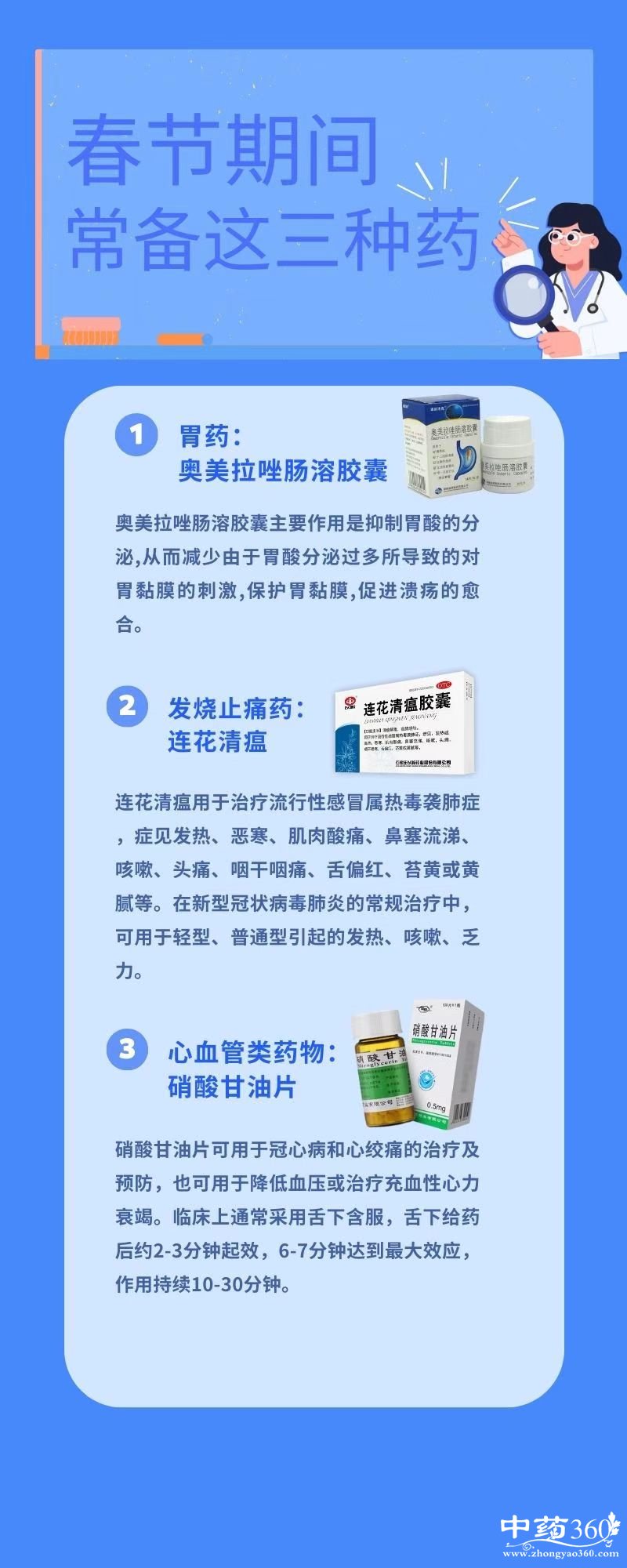 1、胃药。节日期间每天都是大鱼大肉,难免肠胃会出现问题,诸如胃胀胃痛、消化不良等症状时有发生,因此可以准备一些助消化、缓解腹胀腹痛的药物,可以有效缓解胃部不适。