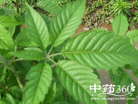 【药材】干燥叶片皱缩,灰黑色或绿褐色,背面色较暗淡,被短毛;为掌状复叶,小叶5枚,间或3枚,长卵圆形至披针形,先端长尖,基部楔形;叶柄方形被毛。叶脆易碎,有香气。