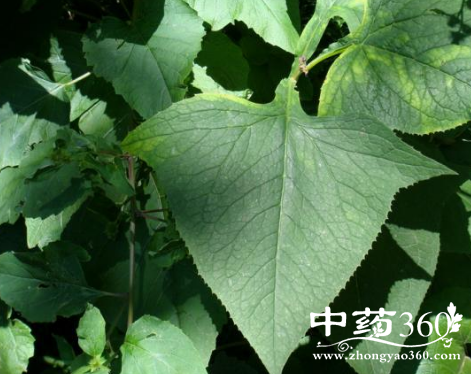 【性状】性状鉴别 茎粗壮,上部密生腺状短柔毛。下部叶枯萎,上、中部叶三角状戟形,基部截形或微心形,下延成上部有狭翅的叶柄,基生叶不抱茎,叶缘具不规则的尖齿。总苞筒状;总苞片狭长圆形或披针形,密生腺状短毛;花筒状,淡白色。气微,味淡。