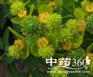 【原形态】大狼毒 多年生草本,高35-55cm。全株含白色乳汁。根圆锥状或圆柱状,直径1-3cm,外皮淡褐色,无侧根或有少数侧根。茎簇生或单一,圆柱形,绿白色,红色或下部绿白而上部有紫红晕,不分枝或上部有分枝。单叶互生;无柄;叶片椭圆状披针形,椭圆状长圆形、披针形至长卵形,长2-5.8cm,宽0.7-1.9cm,先端短尖而钝,基部楔形,全缘,上面绿色,下面灰绿色,有时带红晕。花浅黄色,花序顶生或近顶腋生;顶生花序具5-9枚花梗排列成伞形,基部具5-9枚叶状苞片,成两轮;腋生花梗单一,花梗顶端着生一杯状花序或再作2-4伞状分枝;总苞淡绿黄色,具纵棱,先端5裂,裂片倒卵形,先端微凹或全缘;外侧腺体4-5枚,长圆形,橘红色或杏黄色,内面具白丝毛;雄花多数,通常1-3雄蕊伸出腺体之上,花丝顶端分叉成2个花药;中间雌花1朵,花梗较花丝长,伸出总苞外,子房近球形,密被刺毛,花柱3枚,柱头2叉。蒴果三棱状球形,具小疣状突起及红色刺毛;种子卵形,赭红色,长约5mm,一端具明显白色种阜。花期夏季。