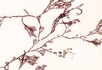 【原形态】藻体紫红色,软骨质,分节清晰,长4-10(-20)cm,直径0.6mm。二叉分枝,枝端钳形,主枝先端弯曲成镰刀状。四分孢子囊散生在钩状部分。囊果生在小枝的顶端。固着器盘状,圆锥形。