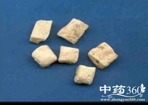 本品成长方形块状,长约3.5厘米,宽约2厘米,厚约1厘米。质硬,色白。上面印有品名,底面平滑。