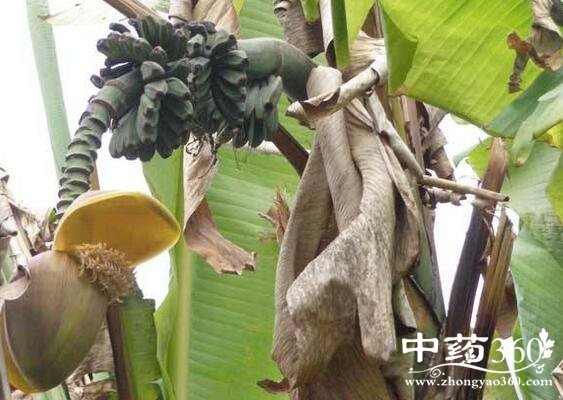 【原形态】 芭蕉,多年生丛生草本,高2.5-4m。叶柄粗壮,长达30cm;叶片长圆形,长2-3m,宽25-30cm,先端钝,基部圆形或不对称,叶面鲜绿色,有光泽。花序顶和,下垂;苞片红褐色或紫色;雄花生于花序上部,雌花生于花序下部;雌花在每一苞片内10-16朵,2列;合生花被片长4-4.5cm,具5(3+2)齿裂,离生花被片几与合生花被片等长,先端具小尖头。浆果三棱状,长圆形,长5-7cm,具3-5棱,近无柄,肉质,内具多数种子。种子黟 以,具疣突及不规则棱角,宽6-8mm。花期8-9月。