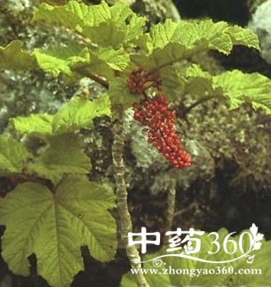【原形态】多刺藻叶灌木,高约1m,稀达3m。根粗大而长,呈棒状,侧根少。茎直立,少分枝,有刺,节部刺多。树皮淡灰黄色,贿部大,呈白色;芽鳞褐色,密生刺毛。单叶互生;叶柄长4-18cm,密生针刺,基部膨大抱茎;叶片掌状3-5裂,长8-20cm,宽12-32cm,裂片三角形或阔三角形,上面无毛或疏生刚毛,下面沿脉有短柔毛,基部心形,边缘有不整齐的锯齿或芽齿,生有刺毛,上面暗绿色,主脉凸起,疏生刺毛,下面淡灰绿色,沿脉密被刺毛,侧脉和网脉均明显。圆锥花序近顶生,长8-18cm,主轴密生短刺和刺毛;伞形花序直径9-13mm,有花6-10朵,棕黄褐色;花颧5,无毛,边缘有5小齿;花瓣5,长圆状三角形,白绿色;雄蕊5;子房下位,2室,花柱2,基部全生或合生至中部,长约3mm。果实为浆果状核果,略呈扁球形,直径7-12mm,黄红色,宿存花柱长4-4.5mm。花期6-7月,果期8-9月。