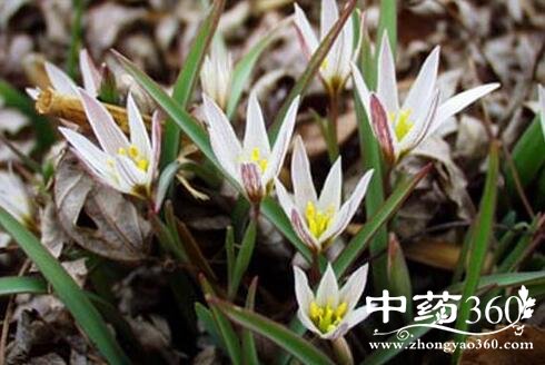 【原形态】多年生草本。地下鳞茎卵圆形,长1.5~2.5厘米,外包多层赤色膜质鳞片,每片内有多数细长金褐色的绒毛。叶通常为2枚,线形,长可达30厘米,平展斜升或呈反卷状,先端尖,全缘,基部下延呈鞘状,具平行脉,两面平滑无毛,上面绿色,近基部略带淡红色。花茎1~3,柔弱;苞片2,对生;花单生于茎端,钟状,直立,开展;花被6,狭长椭圆状披针形,白色,背面有赤紫色纵条纹;雄蕊6,3长3短,雌蕊1,子房椭圆形而呈三棱。蒴果,三角状倒卵圆形。花期2~3月。