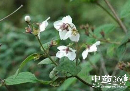 【原 形 态】落叶灌木,高1.5~4米。树皮黄褐色,呈薄片状剥落;幼枝无毛,红褐色。叶对生,椭圆状卵形至披针状卵形,长5~11厘米,宽1.5~3.5厘米,先端渐尖或长渐尖,基部阔楔形或近圆形,边缘有锯齿,上面疏生白色平贴硬毛或无毛,下面叶脉上被白色硬毛,脉腋间并簇生须毛,叶脉自基部5出,主脉基部及叶柄常呈红色或青紫色。总状花序生于侧杖顶端,长5~12厘米,花5~11朵;花径2.5~3厘米;萼筒杯状,顶端4裂,裂片三角状卵形,顶端尖;萼筒与花梗表面均密生白色短硬毛;花瓣4,阔椭圆形或宽卵形,纯白色;雄蕊多数,外轮雄蕊长于内轮;花柱4,近上半部分开,子房下位,4室。蒴果倒卵形,4裂;种子多数。花期5~6月。果期8~9月。
