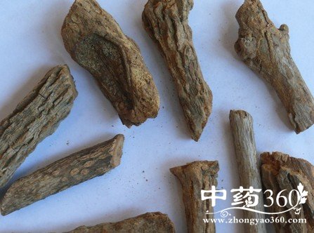 【药材】干燥根呈圆柱状,略弯曲,表面灰棕色,具细纵纹,有多数横向裂隙,支根痕少数。质坚硬,不易折断,断面带破裂状。横切面皮部灰棕色,形成层明显,木部淡黄色,导管群呈放射状,导管清楚,呈小空洞,木射线较导管群窄,呈深黄色。
