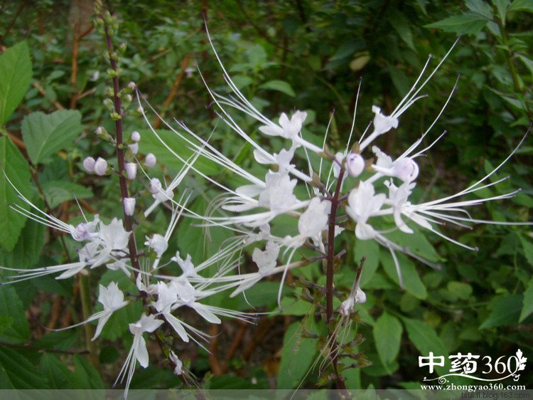 【植物形态】多年生直立草本。茎被短柔毛。叶对生,有柄;叶片纸质,卵形或卵状长圆形,顶端渐尖或稍钝头,基部阔楔尖,两面被短柔毛,边缘有齿缺。夏、秋季开花,花淡紫色或白色,排成顶生总状花序,此花序系由多个轮伞花序复合而成,萼钟形,结果时增大,被微柔毛和腺点,檐部二唇形,上唇圆形,下唇4裂,2中裂片显然较长,均芒尖,花冠被微柔毛,管狭圆筒状,冠檐上唇阔大,伸展,下唇直立,较狭;雄蕊4枚,生于喉部,花丝伸出花冠之外,形似猫须。小坚果卵形,深褐色,表面有网纹。