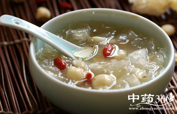 银耳莲子汤是常用的滋阴食物,也是很好的滋补品,历来被看做“延年益寿之品”。银耳性平,味甘淡,有润肺生津、滋阴养胃、益气安神、健脑强心的功效。银耳莲子汤中的胶质滋阴作用极佳,女人常服能够润肤美白、祛除面部斑点。