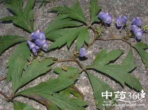 【原形态】松潘乌头,多年生草本。块根近圆形,长约3.5cm,茎缠绕,长达2.5m,无毛或几无毛,有分枝。叶互生;茎中部叶有稍长柄;叶片五角形,长5.8-10cm,宽8-12cm,3全裂,中央全裂片卵状菱形或近菱形,下部3裂,两面被疏短柔毛。总状花序有5-9朵花;花序轴和花梗无毛或疏被反曲短柔毛;下部苞片3裂,上部苞片线形;花梗长2-4cm,多少弧状弯曲;小苞片生花梗中部至上部,线状钻形;花两性,两侧对称,萼片5,花瓣状,淡蓝紫色,外面无毛或有短柔毛,上萼片高盔形,高1.8-2.2cm,下缘长1.4-1.5cm,稍凹,外缘近直或中部稍缢缩,与下缘形成短喙,侧萼片长1.3-1.5cm;花瓣2,唇长4-5mm,微凹,距长1-2mm,向后弯曲,无毛或疏被短毛;雄蕊多数,花丝无毛或有短毛,全缘;心皮5,无毛或疏被短毛。蓇葖果,长1-1.5cm,无毛或疏被短柔毛。种子多数,三棱形,长约3mm,沿棱生狭翅,只在一面密生横膜翅。花期8-9月,果期9-10月。