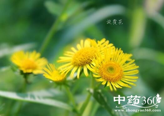 【性状】干燥头状花序呈扁球形,有时散落,直径8~15毫米(线叶旋复花较小,4~10毫米)。底部有4层(线叶旋复花3层)浅灰绿色、膜质的总苞片,有时残留花梗。外缘1层舌状花,黄色,长约1厘米,先端3齿裂,多卷曲;中央管状花密集,花冠5齿裂,子房顶端有多数白色冠毛,长约5毫米(线叶旋复花长约3毫米),质柔软,手捻易散。气微弱,味微苦咸。以朵大、金黄色、有白绒毛,无枝梗者为佳。