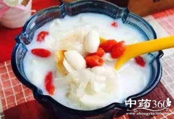 材料:花生100克,银耳30克,牛奶约1500毫升。另备冰糖和枸杞适量。
