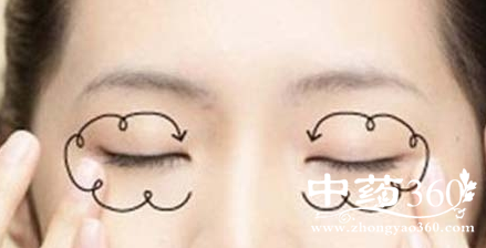 七、绕眼眶:中指、无名指指腹以打圈的方式按摩,从内眼角至外眼角做环绕按摩。