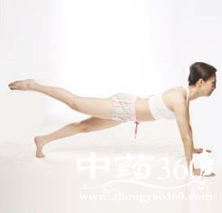 STEP4:四肢支撑地面,将左腿向后伸直,左腿上抬令臀部集中用力。上举无需太高,与身体成一直线即可,注意腹部要稍微收敛,以免伤及下脊椎,反复约2O次。完成后换右腿再重复一次。