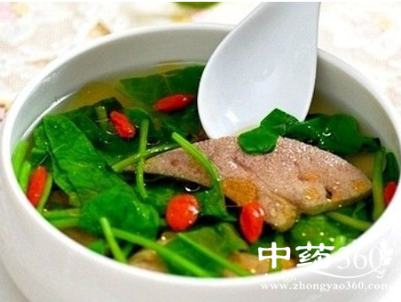 原料:猪肝,350克,菠菜150克,枸杞适量。