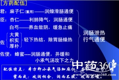 枳实下气破结,厚朴行气除满,以加强降泄通便之力,用以为佐。使以蜂蜜润燥滑肠,调和诸药。综观全方,重用麻子仁滋脾润肠,配伍大黄、枳实、厚朴泄热导滞,组成攻润相合之剂。使腑气通顺,津液充足,下不伤正,主治脾津不足,肠胃燥热之脾约证。