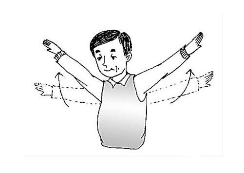 双臂向身体两侧伸开,和地面平行,类似钟表9点15分时时针与分针的位置;然后双臂同时向10点10分的位置抬起,再回落9点15分的位置。重复这个动作,连续做20~30次。腰肌、背肌、胸肌、颈部肌肉都得到锻炼。