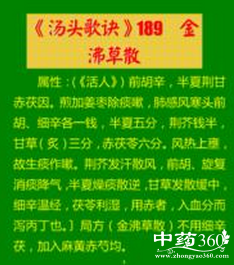 【方歌】 金沸草散疏风寒,前胡荆芥细辛甘,半夏茯苓生姜枣,头昏咳嗽属外感
