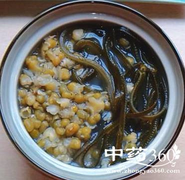 取海带、绿豆各150克,红糖适量。将海带、绿豆共煮至熟烂后,用红糖调味,每日2次,宜常服。