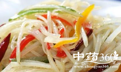 2、油锅烧热,放土豆丝、黄椒丝,加白醋、盐、味精,炒熟即可食用。