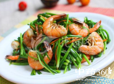 虾洗净取仁,韭菜洗净切段;先用热油锅煸炒虾仁,然后入醋等其余调味品,稍烹即可;将韭菜煸炒至嫩熟为度,烩入虾仁即成。每日1剂,经常食用。补虚助阳,适用于阳痿、不育症、不孕症的辅助治疗。