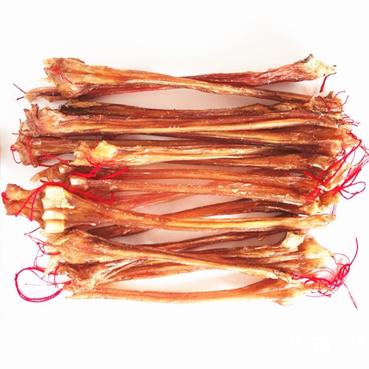 干燥的鹿筋,细长条状,金黄或棕黄色,有光泽而透明。长45~65厘米左右,粗约1.5~2厘米。上端带肉质,下部有半圆形黑色蹄甲之个,亦有带4个小块蹄骨者;蹄甲处略带皮,有棕色或淡棕色短毛。质坚韧,气微腥。以身干、条长、粗大、金黄色有光泽者为佳。
