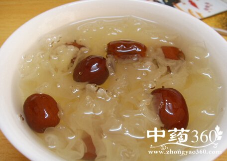 做法:把银耳放在清水中发开,摘去蒂头,撕成小块,与红枣、冰糖一起放到锅里,加水6碗,大火煮开后,改用文火再煮半个小时,即可熄火。