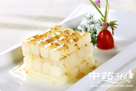 一、蜜枣扒山药——治肺虚久咳材料:山药1000克,蜜枣10个,板油丁100克,白糖350克,桂花汁。湿淀粉。熟猪油少许。