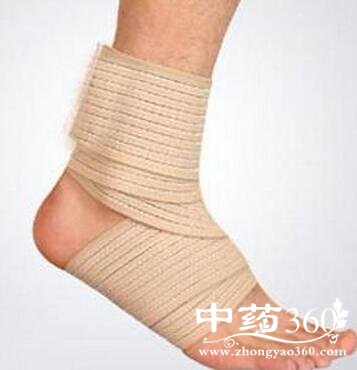 冷敷的同时或冷敷后,可用绷带、三角巾等布料加压包扎踝关节周围。也可用数条宽胶布从足底向踝关节及足背部粘贴、固定踝关节,以减少活动度。无论包扎或用胶布粘贴,均应使受伤的外踝形成足外翻,或受伤的内踝形成足内翻,即外踝受伤者应保持外踝松弛位,内踝受伤者保持内踝松弛位。以减轻对受伤的副韧带或肌肉的牵拉,从而减轻或避免加重损伤。