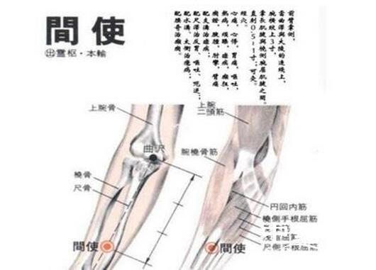 间使穴位配伍:间使穴配尺泽穴缓解治疗反胃、呕吐、呃逆; 间使穴配支沟穴缓解治疗疟疾;间使穴配腰奇穴缓解治疗癫痫。