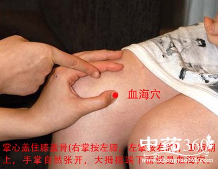 血海穴位于大腿内侧,从膝盖骨内侧的上角,上面约三指宽筋肉的沟,一按就感觉到痛的地方,有称为血海的穴位。(坐在椅子上,将腿绷直,在膝盖内侧会出现一个凹陷的地方,在凹陷的上方有一块隆起的肌肉,肌肉的顶端就是血海穴,或者用自己的掌心盖住膝盖骨(右掌按左膝,左掌按右膝),五指朝上,手掌自然张开,大拇指端下面便是血海穴。)