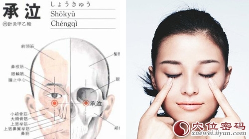承泣穴位配伍:承泣穴配太阳穴缓解治疗目赫肿痛,承泣穴配阳白穴缓解治疗口眼歪斜。