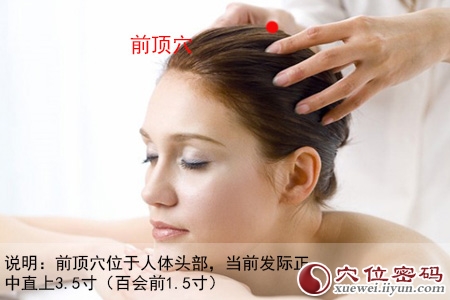 按摩前顶穴的手法:用中指指腹按揉前顶穴并做环状运动,注意按压时力度要适中,每次按摩2分钟或者根据需要而定。