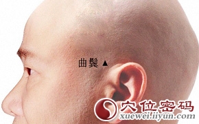 曲鬓穴属于足少阳胆经。曲鬓穴位于人体的头部,当耳前鬓角发际后缘的垂线与耳尖水平线交点处。