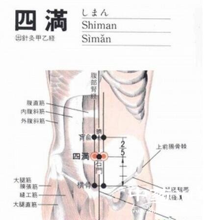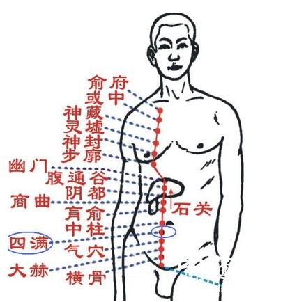四满穴属于足少阴肾经穴位图,四满穴位于人体的下腹部,当脐中下2寸,前正中线旁开0.5寸。