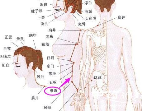 维道穴属于足少阳胆经,维道穴位于人体侧腹部,当髂前上棘的前下方,五枢穴(横平脐下3寸)前下0.5寸。