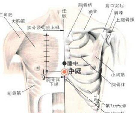 中庭穴位于胸部,当前正中线上,平第5肋间,即胸剑结合处