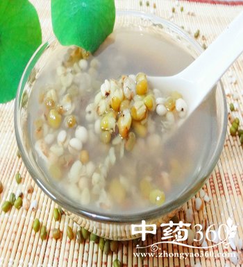 将绿豆和薏米分别浸洗干净之后,用武火先煮开,然后改文火慢煮,直至绿豆烂了,加入适量的红糖就可。