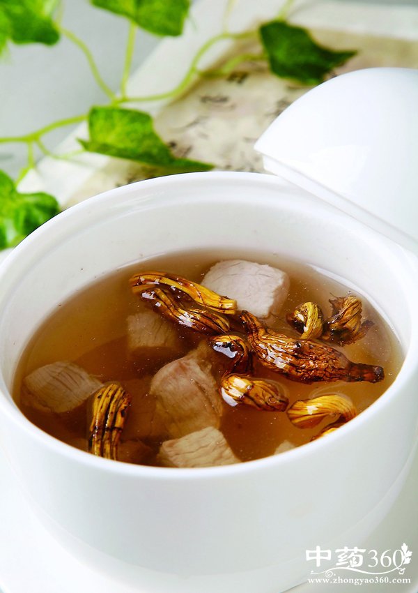 中药石斛性平味甘,有养胃阴、生津液、除虚热之功。近年来潮汕一带十分推崇以其炖或煲汤,并以选用霍山石斛为佳,其形甚细,而色泽金黄,望之润泽,嚼之味厚。该石斛味厚而富脂膏,养胃液,却无清凉碍脾之虑,确为佳品。倒扣草是南方的中草药,性寒味苦辛,功能清热、解表、利水、活血。猪瘦肉功能补阴益髓,在这汤中既为药引又可使汤味鲜美、可口,因而令此汤具有滋阴清热之功。由于重用石斛和炖制,所以没有寒凉之性,很适合体虚者或老幼妇孺夏日之用。