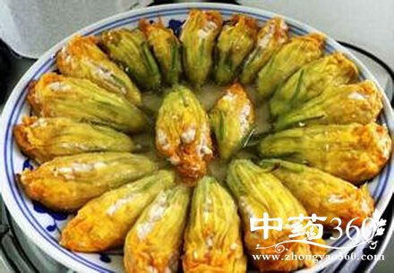 南瓜花清利湿热、消肿散瘀,常作强身保健食品。实践证明,其花粉能消除疲劳,增强运动员斗志,使老年人重获青春活力。据新加坡营养学家研究发现,食用南瓜花,还能让儿童有效地提高智商。
