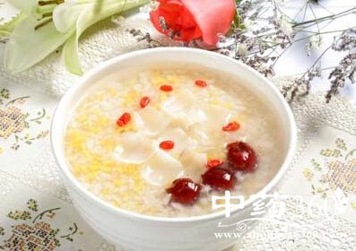 2、三者同入锅内,加清水适量,旺火煮开后,文火熬煮成粥。