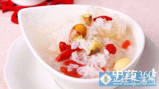 龙眼肉15克、枸杞子10克、红枣4粒、粳米100克、瘦肉碎100克,加清水文火煮粥。可作早餐或消夜之用。