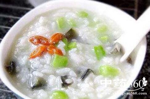 西瓜皮粥:西瓜皮200克,粳米100克,白糖30克。西瓜皮削去外表硬皮,切成丁,与粳米同煮。先用旺火煮沸,再转用小火煮成粥,放入白糖即成。西瓜皮具有清热解暑、利尿消肿的作用。