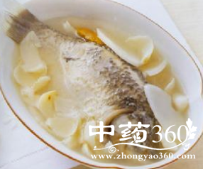鲫鱼有除湿利水、和中补虚、和胃健脾,促进食欲的作用,用于治疗乳闭、水中诸疮、肠癖泻痢、胃弱不思食等症状。百合醇甜清香,甘美爽口。味鲜甜,含有丰富蛋白质、钙、磷、铁以及多种维生素。中医认为:百合味甘,微苦,性寒,无毒入肺、心二经。具有润肺止咳、清心安神、补脾健胃、滋阴养肾、防癌抗衰老之功效。