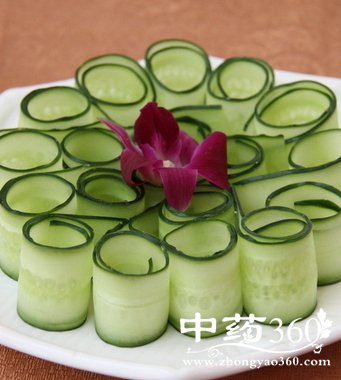 味甘,性平,具有明显的清热解毒、生津止渴功效。黄瓜富含蛋白质、糖类、维生素B2、维生素C、维生素E、胡萝卜素、尼克酸、钙、磷、铁等营养成分,同时还含有丙醇、二酸、葫芦素、柔软的细纤维等成分,是难得的排毒食品。黄瓜所含的黄瓜酸,能促进人体新陈代谢,排出毒素;维生素C的含量比西瓜高五倍,能美白肌肤,使其保持弹性,抑制黑色素的形成。而且,黄瓜还能抑制糖类物质转化为脂肪,对肺、胃、心、肝及排泄系统都非常有益。夏日里容易烦躁、口渴,假如喉痛或痰多,吃黄瓜有助于化解炎症。