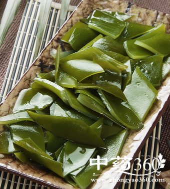 味咸,性寒,有化痰、消痰、平喘、排毒、通便的功效。海带富含藻胶酸、甘露醇、蛋白质、脂肪、糖类、粗纤维、胡萝卜素、维生素B、维生素B2、维生素C、尼克酸、碘、钙、磷、铁等多种成分,尤其是含丰富的碘,对人体十分有益,可治疗甲状腺肿大和碘缺乏而引起的病症。它所含的蛋白质中,包括18种氨基酸。